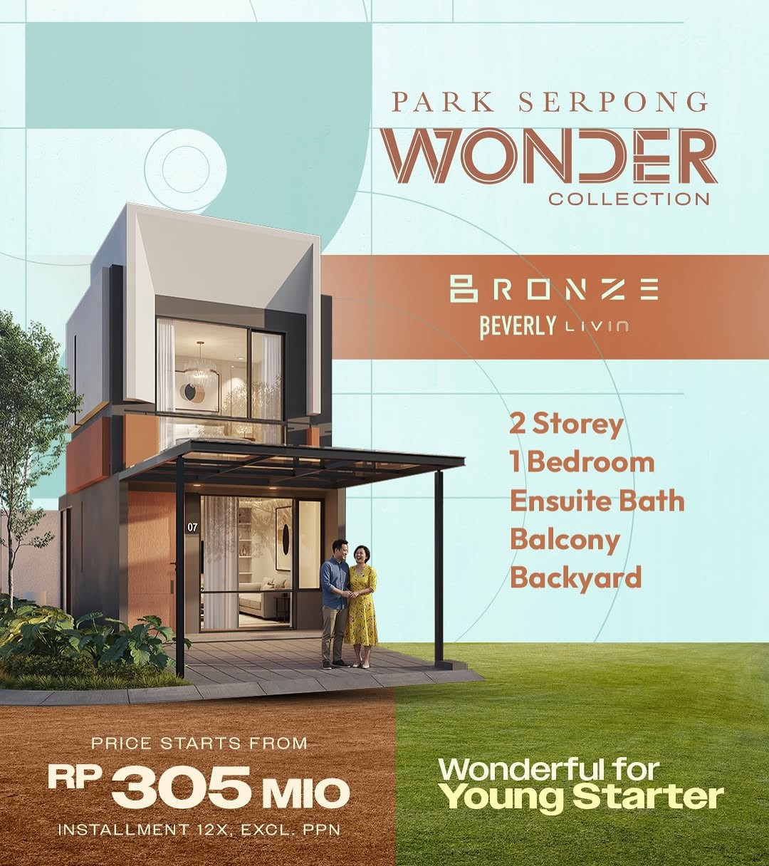 Hunian modern 2 lantai dengan 1 kamar tidur, ensuite bathroom, balkon, dan backyard yang nyaman. Desain elegan cocok untuk young starter yang mencari rumah pertama dengan kualitas premium. Harga mulai dari Rp305 jutaan dengan skema cicilan hingga 12x (excl. PPN).